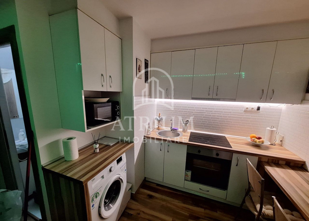 Garsoniera este complet mobilată și utilată și a fost recent zugrăvită, fiind pregătită pentru mutare imediată. Printre dotări se regăsesc frigider, masina de spalat rufe, plită, hotă, cuptor, cuptor cu microunde și televizor, oferind toate facilitățile necesare pentru un trai confortabil.