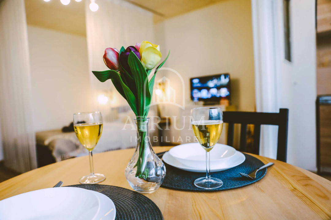 Garsoniera este complet mobilată și utilată (mașină de spălat, frigider, TV, aer condiționat), gata de locuit imediat.