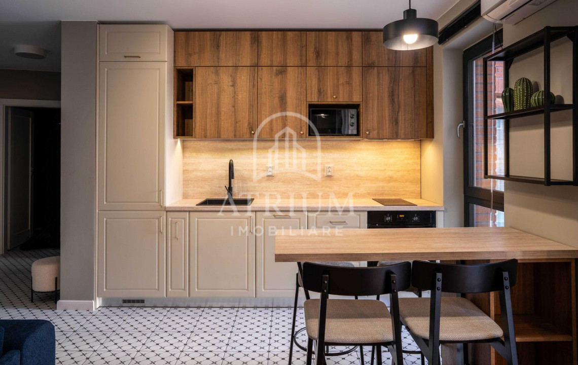 Locuința se închiriază complet mobilată și utilată, cu mobilier modern și funcțional, și beneficiază de toate electrocasnicele necesare: frigider, hotă, cuptor, plită, cuptor cu microunde, mașină de spălat haine cu uscător, mașină de spălat vase și televizor. De asemenea, apartamentul dispune de aer condiționat atât în living, cât și în dormitor.