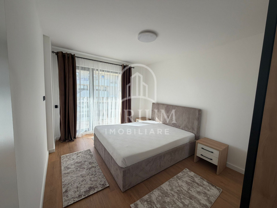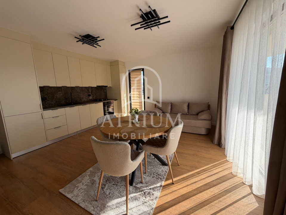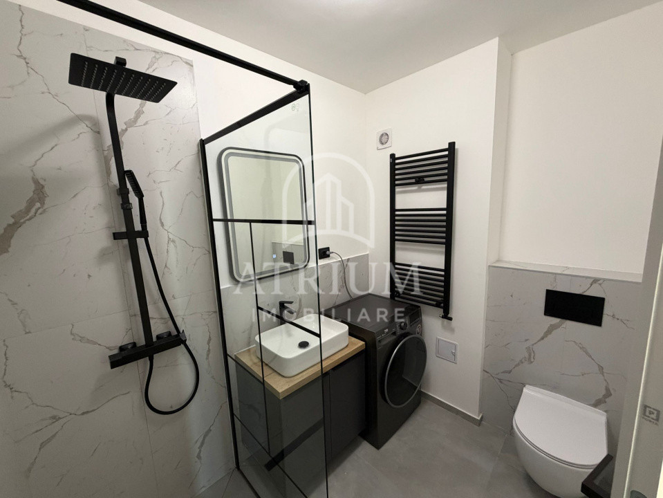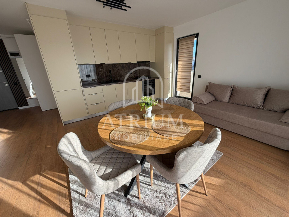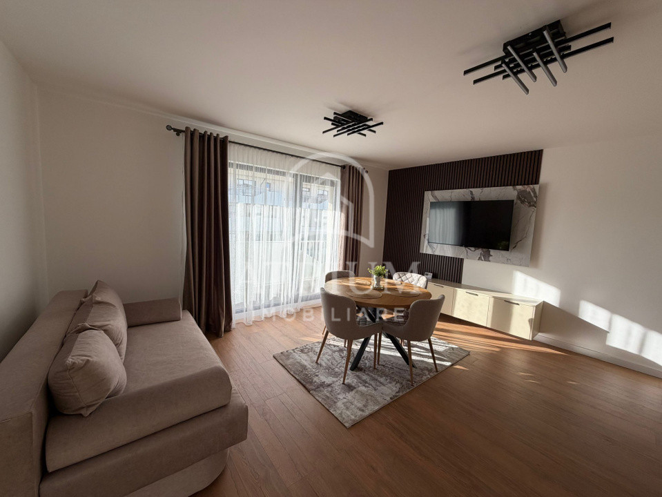 Mobilat utilat la cheie, dotat cu: smart TV, masina de spalat rufe, uscator de rufe, aragaz, cuptor, frigider si hota.