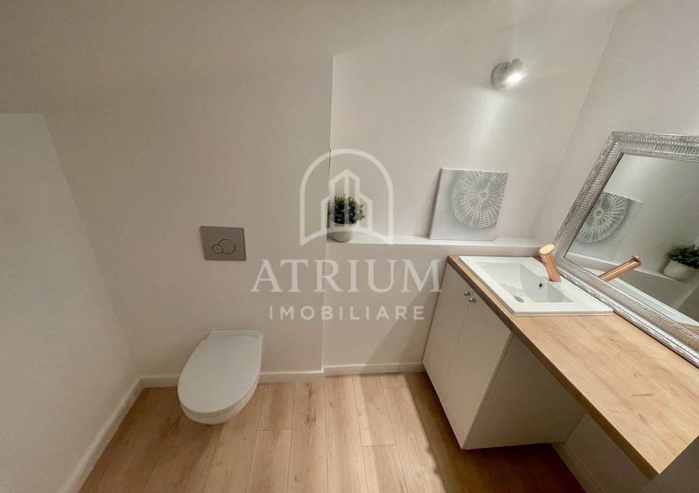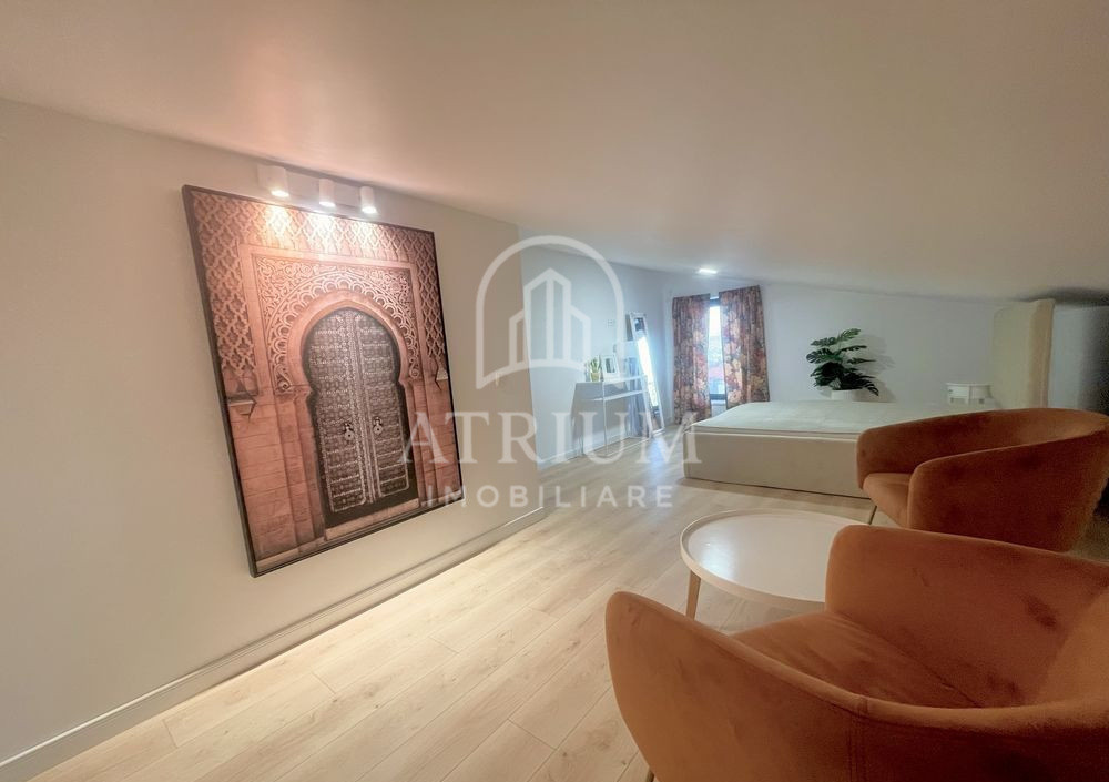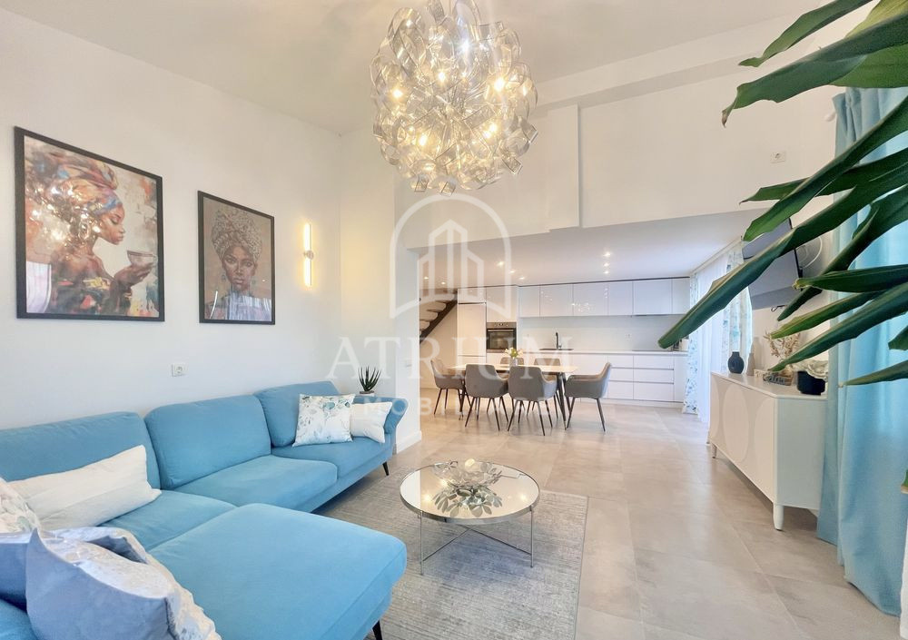 Locuința dispune de trei camere semidecomandate, cu posibilitate de recompartimentare în patru camere. Spațiul este generos și bine structurat: living cu bucătărie și zonă de luat masa, două dormitoare spațioase, două băi, precum și o terasă cu vedere amplă asupra orașului. Dormitorul de la etaj oferă intimitate, baie proprie și spațiu pentru amenajarea unui dressing.
