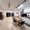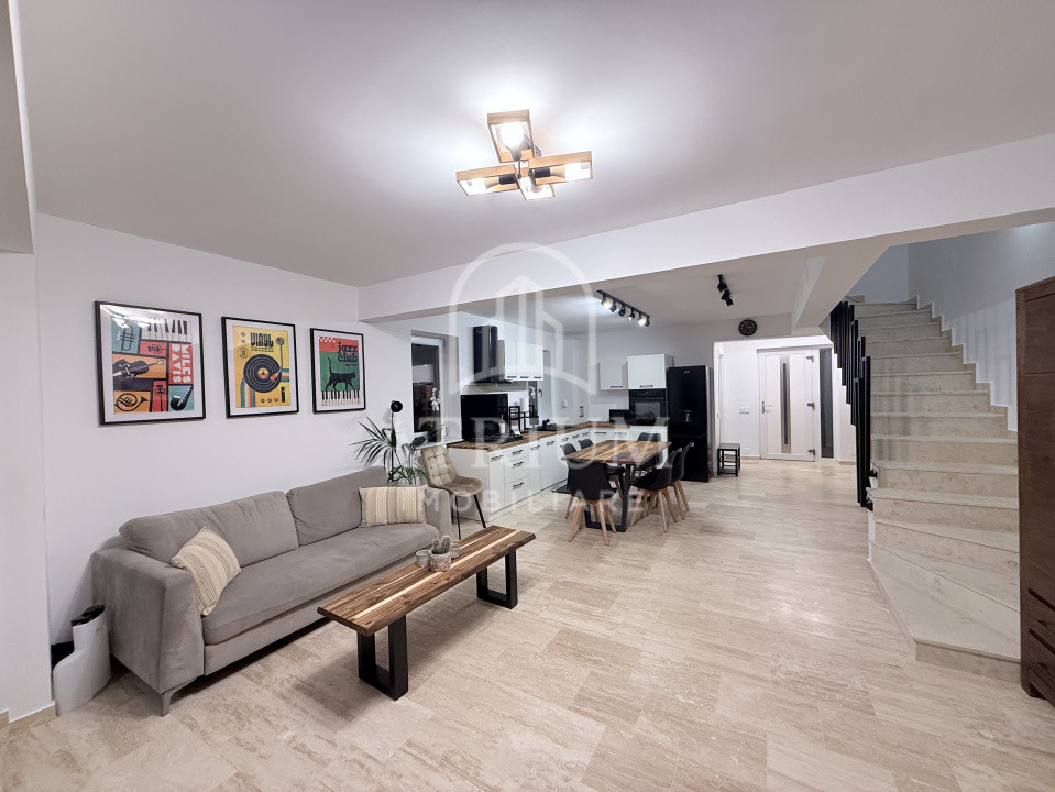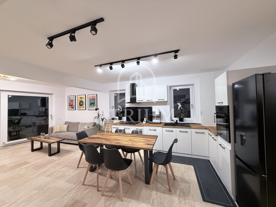 La parter se află un living generos cu bucătărie open-space, complet echipată cu frigider, mașină de spălat vase, cuptor electric, cuptor cu microunde, aragaz și hotă, precum și o baie modernă cu duș walk-in.