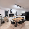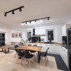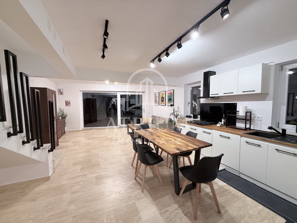 La parter se află un living generos cu bucătărie open-space, complet echipată cu frigider, mașină de spălat vase, cuptor electric, cuptor cu microunde, aragaz și hotă, precum și o baie modernă cu duș walk-in.
